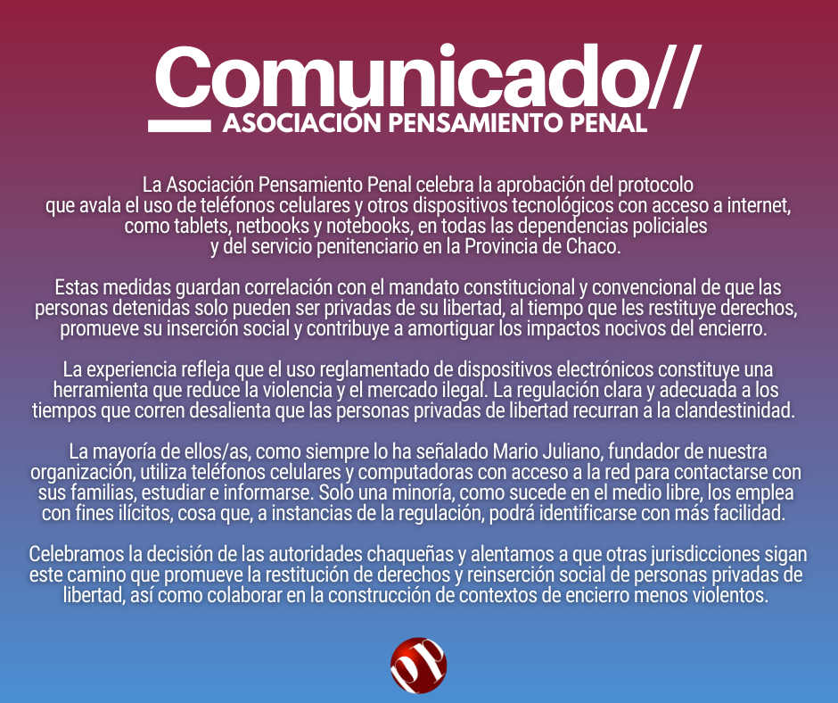 La Asociación Pensamiento Penal celebra la aprobación del protocolo que avala el uso de teléfonos celulares y otros dispositivos tecnológicos con acceso a internet, como tablets, netbooks y notebooks, en todas las dependencias policiales y del servicio penitenciario en la Provincia de Chaco.