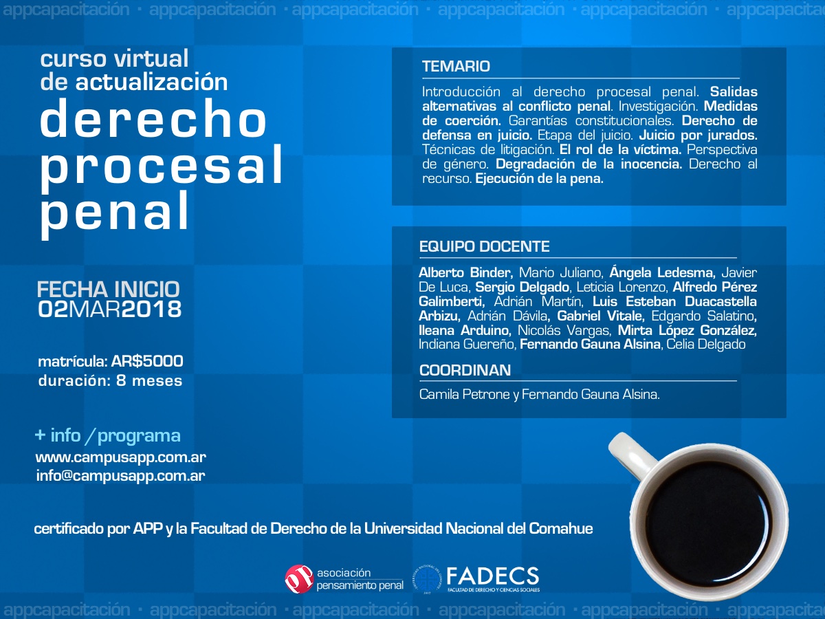 Certificado: Curso certificado por la Asociación de Pensamiento Penal y la Facultad de Derecho de la Universidad Nacional del Comahue. El certificado será remitido por correo postal al estudiante que apruebe el curso.