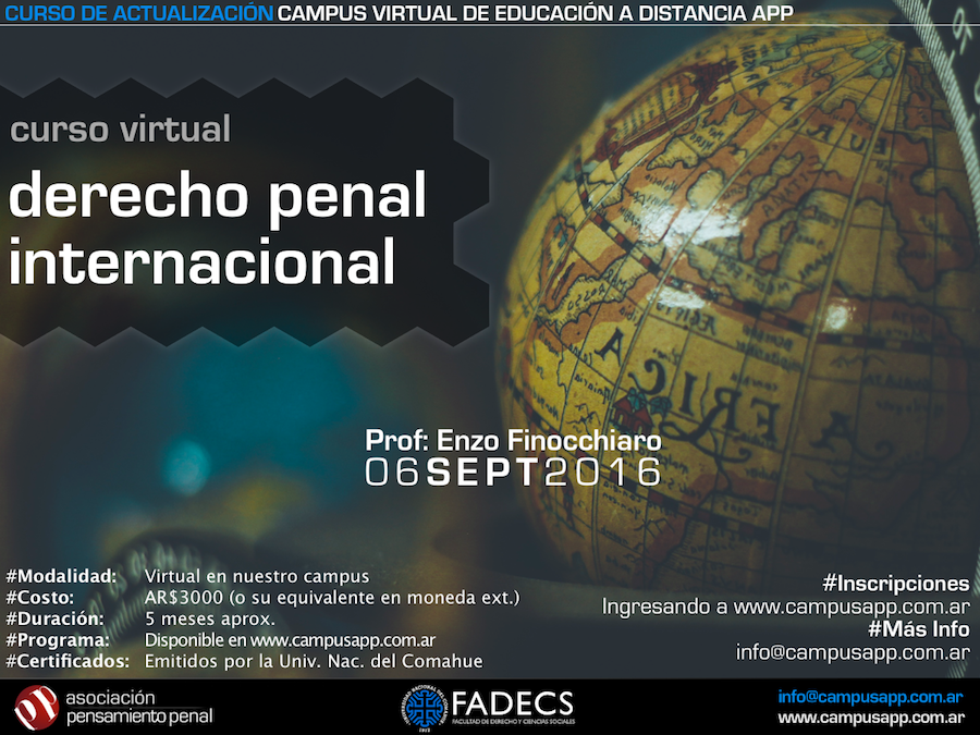 Certificado: Curso certificado por la Universidad Nacional de Comahue y por la Asociación de Pensamiento Penal. El certificado será remitido por correo postal al estudiante que apruebe el curso.