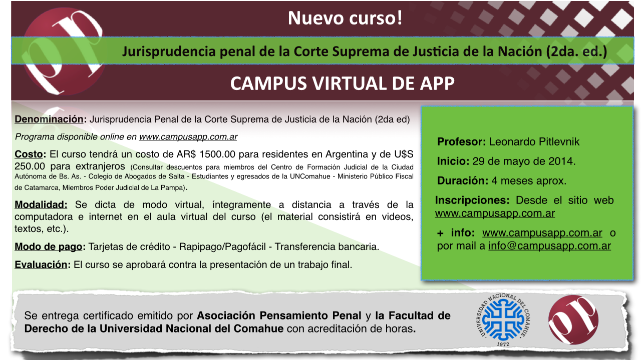 Nuevo Curso: «Jurisprudencia Penal de la Corte Suprema de Justicia de la Nación (2da. Edición)». Dictado por el prof. Leonardo Pitlevnik Inicia el 29 de mayo de 2014. Programa del curso: Click aquí para ver Más información aquí