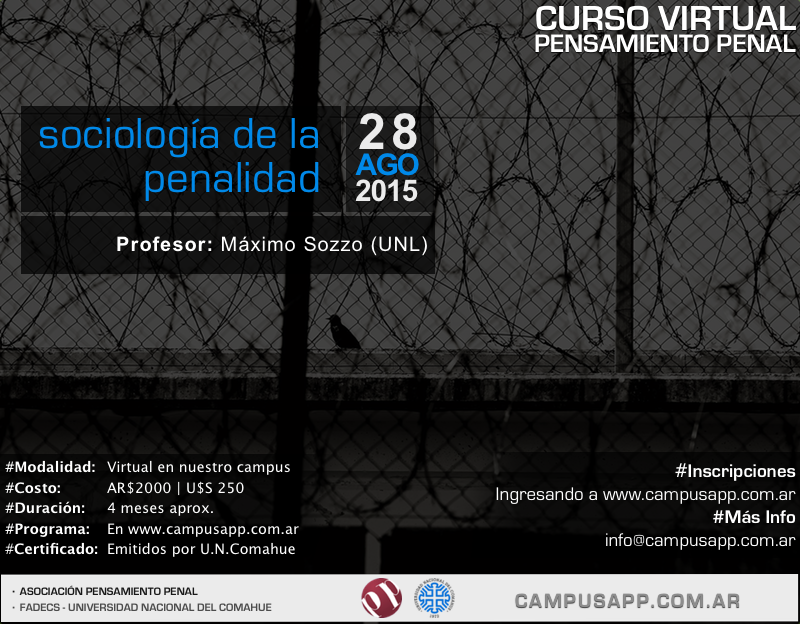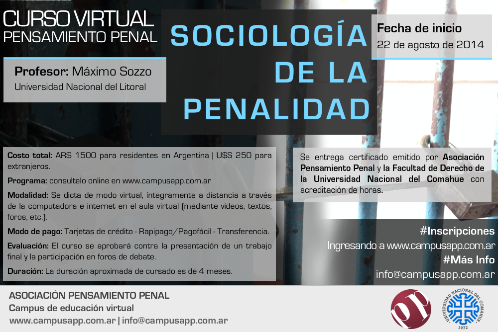 Nuevo curso Sociología de la penalidad. Dictado por el prof. Sozzo en nuestro campus virtual a partir del 28 de agosto de 2015. Programa disponible aquí Más información aquí