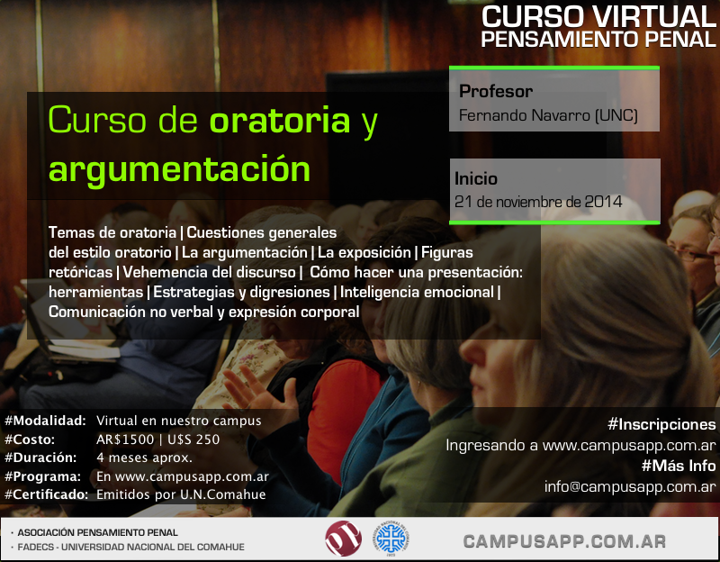Curso de oratoria y argumentación Prof. Fernando Navarro (UNC) Inicia 21 de noviembre de 2014 Más info en www.campusapp.com.ar Programa aquí Video de presentación