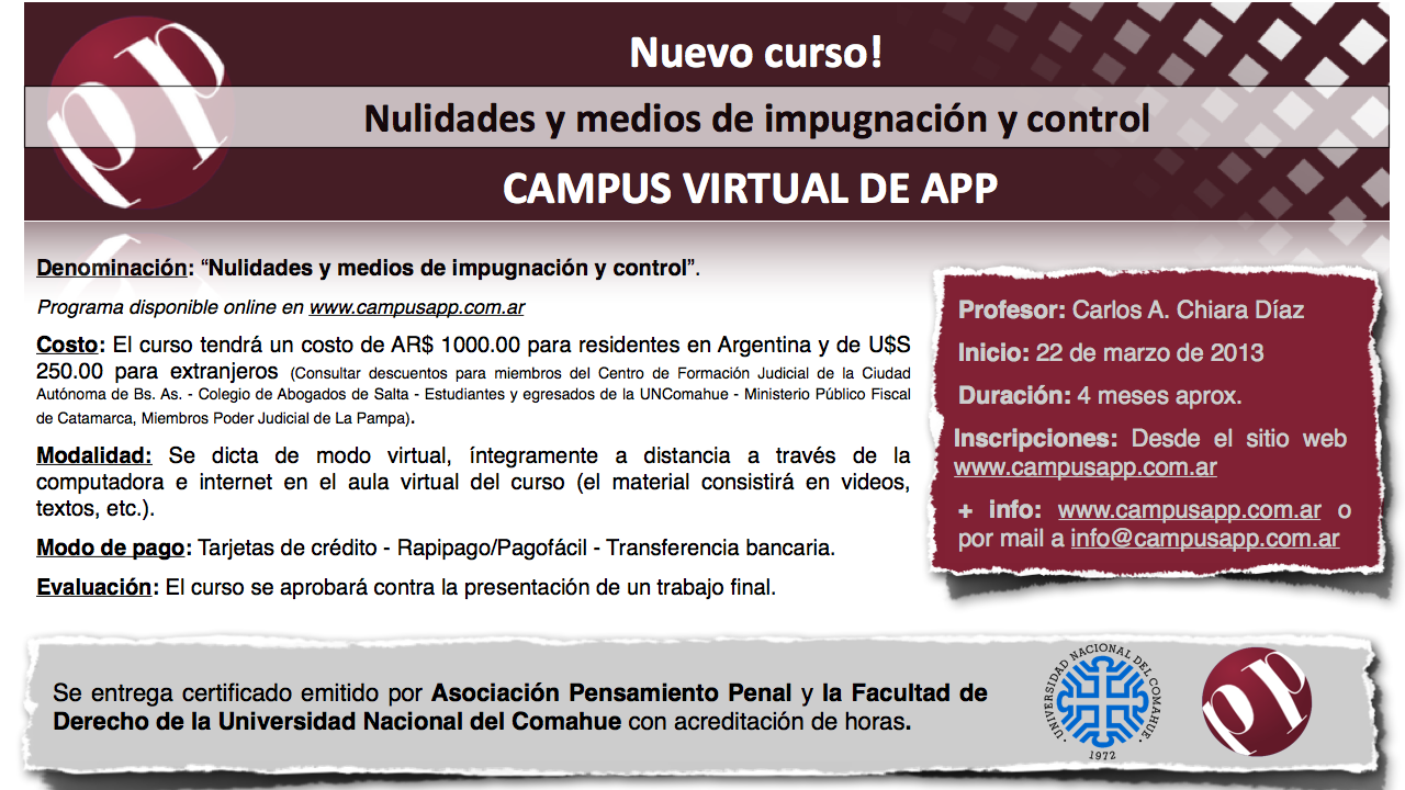 Nuevo Curso: «Una defensa eficiente: estrategias dogmáticas y procesales». Dictado por el prof. Maximiliano Rusconi Inicia el 21 de abril de 2014. Programa del curso: Click aquí para ver Más información aquí