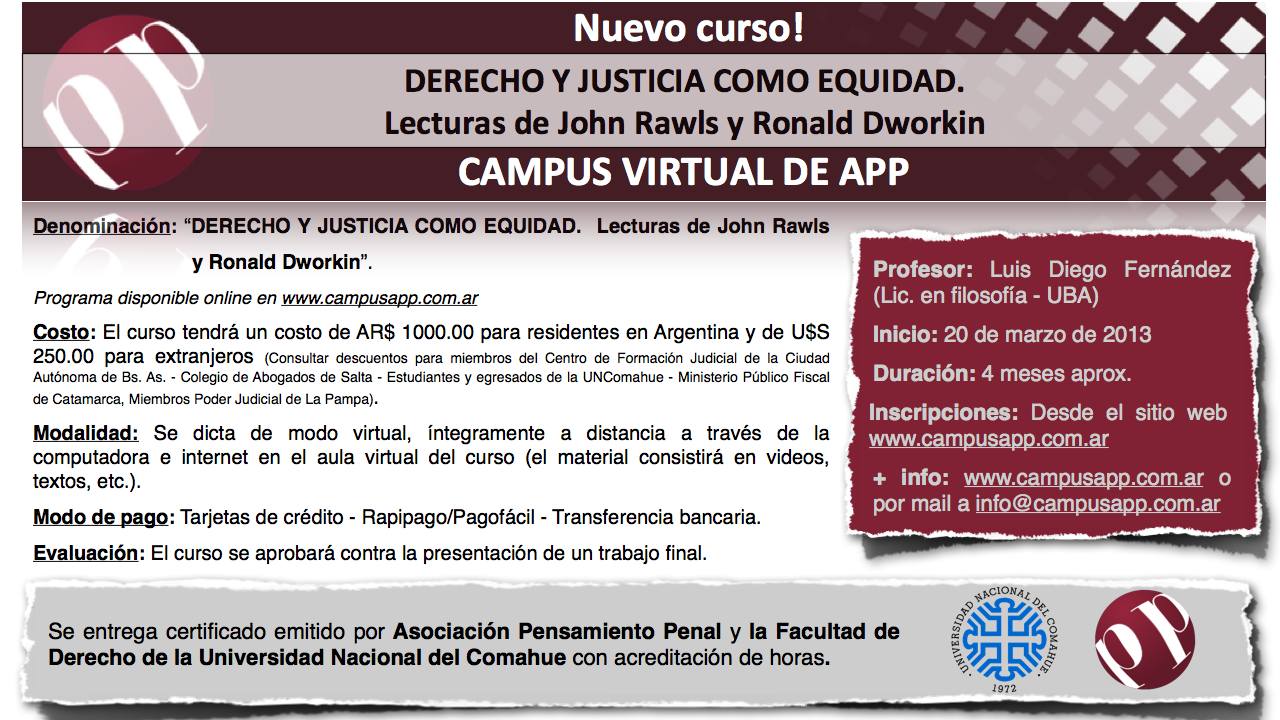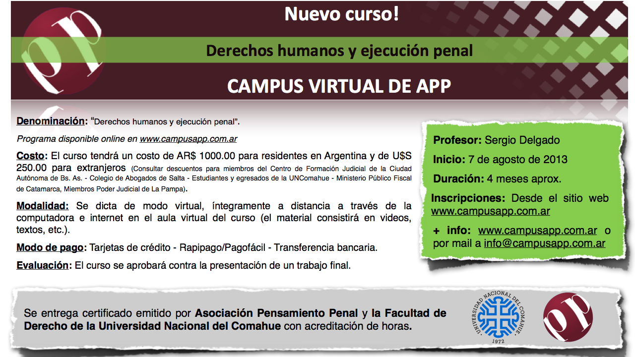 Nuevo Curso: «Derechos humanos y ejecución penal». Dictado por el prof. Sergio DelgadoInicia el 7 de agosto de 2013. Programa del curso: Click aquí para ver Más información aquí