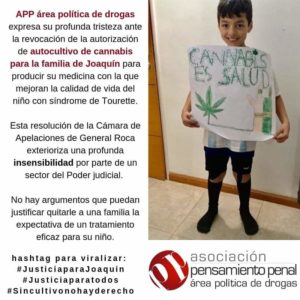 APP área política de drogas expresa su profunda tristeza ante la revocación de la autorización de autocultivo de cannabis para la familia de Joaquín para producir su medicina con la que mejoran la calidad de vida del niño con síndrome de Tourette.