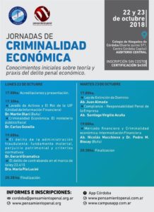 La Asociación Pensamiento Penal, capítulo Córdoba, co-organiza junto al Colegio de Abogados de Córdoba la «JORNADA DE CRIMINALIDAD ECONÓMICA. Conocimientos iniciales sobre teoría y praxis del delito penal económico.», a realizarse los días 22 y 23 de octubre en el Colegio de Abogados de Córdoba.