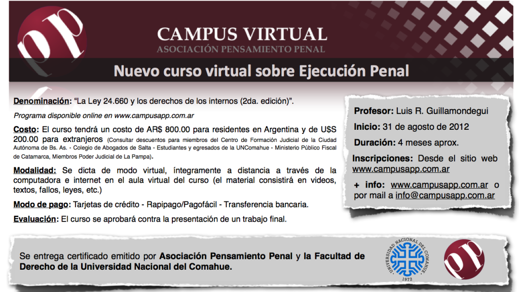 Nuevo curso sobre Ejecución Penal en nuestro Campus virtual dictado por el prof. Luis Guillamondegui 09/08/2012Académicas