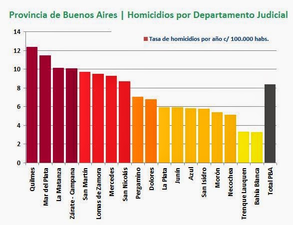Así que -disponibles datos de la Provincia de Buenos Aires 2013- nos abocamos a hacer el desglose más fino del que hay datos públicos: homicidios agrupados por Departamento Judicial (que no coinciden con partidos comunales, y normalmente agrupan varios de ellos), cada uno de los cuales, por población y peculiaridades, podría ser considerado una provincia en sí mismo.