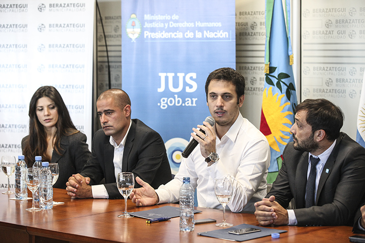 El secretario de Justicia, Julián Álvarez, y el intendente de Berazategui, Patricio Mussi, firmaron hoy un convenio para la inserción laboral de personas que, teniendo domicilio en esa localidad, hayan cumplido su condena y egresen del Servicio Penitenciario Federal (SPF). «Berazategui será el primer municipio que va a tener una pasantía rentada para personas que egresen del SPF», dijo Mussi tras la firma del convenio.